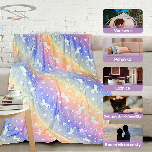 Příjemná a teplá deka vydává v noci světlo! Můžete si vybrat vzor jednorožce nebo dinosaura!