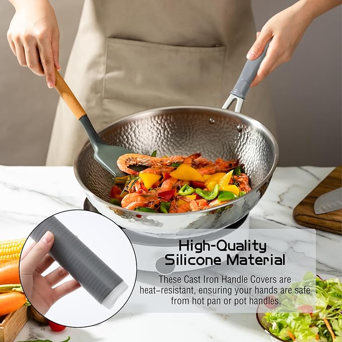 Vařte bez obav a chraňte si ruce pomocí našich žáruvzdorných silikonových krytů rukojetí. Tyto kryty jsou vyrobeny tak, aby se hodily pro různé velikosti rukojetí hrnců a pánví, zajišťují bezpečné uchopení a zároveň účinně izolují teplo, aby rukojeti zůstaly chladné na dotek.